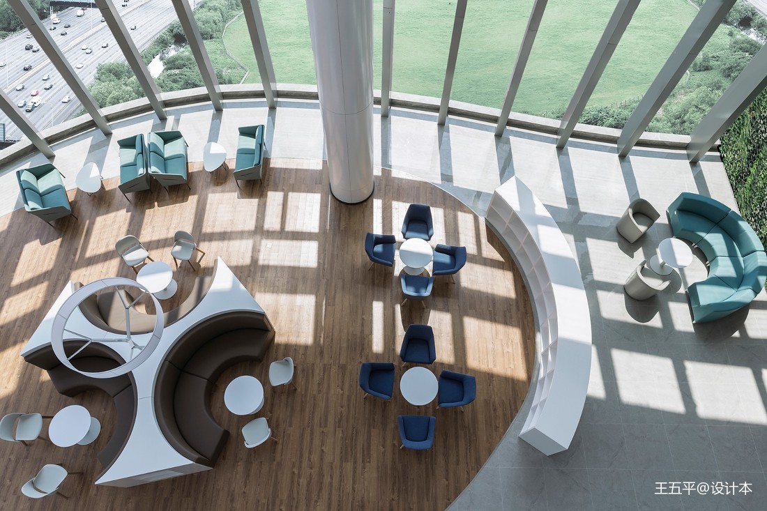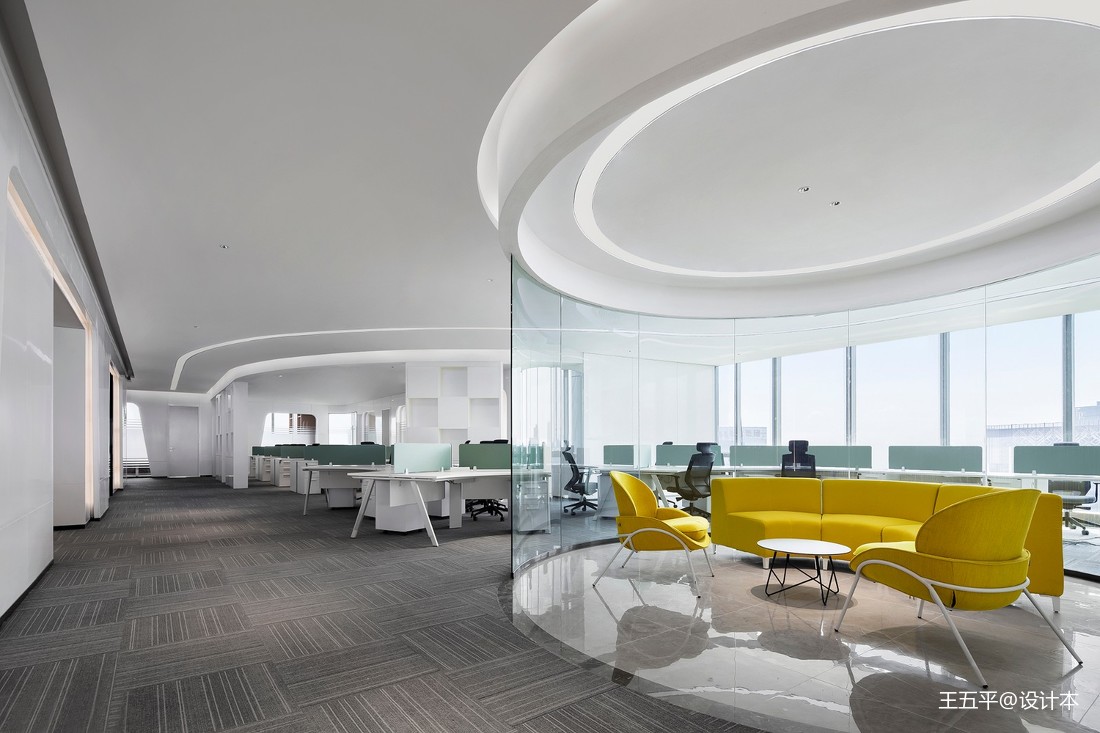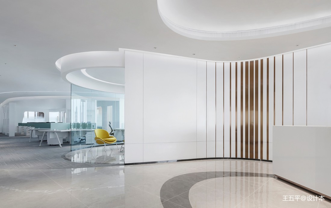 俯瞰空間,光陰交織,線面糅合。曲線元素打破呆板和無趣,賦予空間多變性。弧度背景緩解空間突兀感,將空間柔化,并貫穿空間每一個角落。簡單而充滿未來感的燈具,在低調(diào)中,卻成為另一亮點,迸發(fā)著設(shè)計師的創(chuàng)意與靈感。開放式的空間,辦公、洽談或是端詳風(fēng)景,洋溢著的高端與時尚,溢于言表。