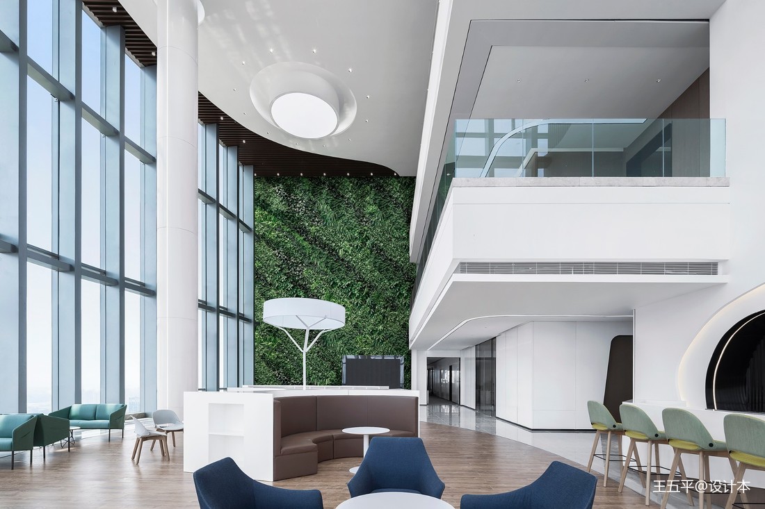 本項目盤踞于南寧市五象新區(qū),恢弘大氣。室內(nèi)辦公大堂則延續(xù)了建筑風(fēng)格,糅合了科技與藝術(shù)的理念,以創(chuàng)新的手法抒寫現(xiàn)代化辦公國際風(fēng)貌。中空大堂的室內(nèi)有三層之高,四周柱子撐起了豪邁的空間風(fēng)骨,設(shè)計以白色為主色,搭配以綠、藍、褐,藉由造型和色彩的純粹性,帶來無與倫比的審美享受。